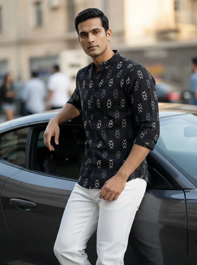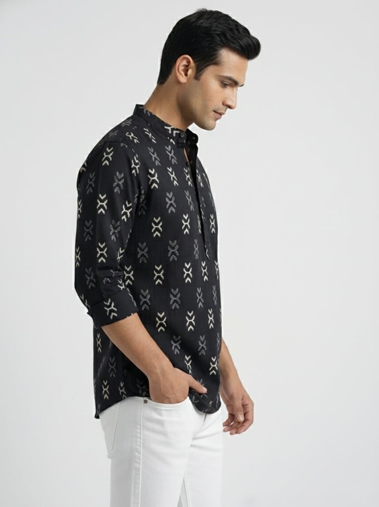 Crafted from high-quality Cotton fabric, the Vida Loca Printed Button-Up Kurta ensures a comfortable and breathable feel, making it perfect for the summer weather. The Chinese collar adds a touch of sophistication, while the curved hemline enhances the shirt's stylish appeal.