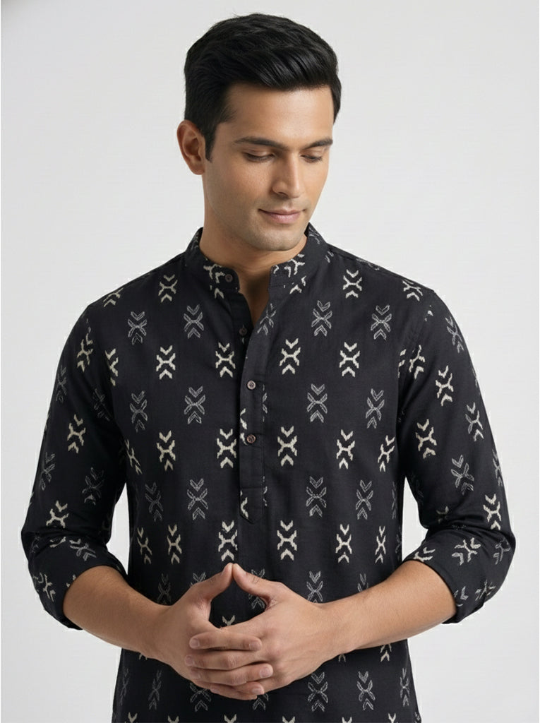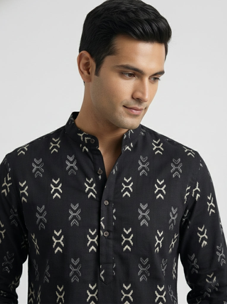 Introducing the vibrant and stylish Vida Loca Printed Button-Up Kurta in a captivating Black design! 🎨🌈 This Kurta is designed to elevate your style with its regular fit and eye-catching triangle print pattern. Here are the details: