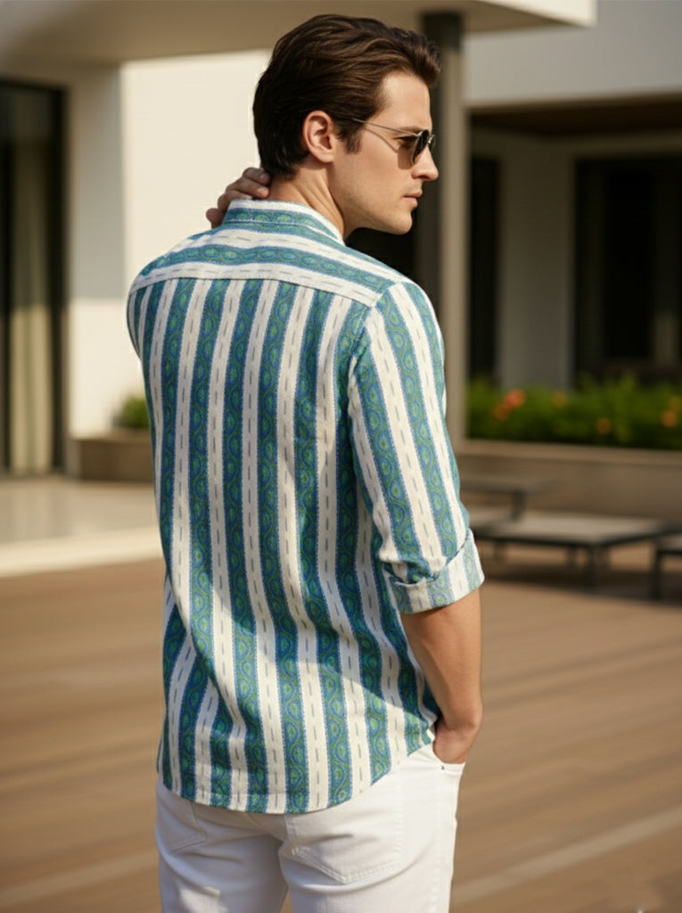 Crafted from high-quality Cotton fabric, the Vida Loca Printed Button-Up Kurta ensures a comfortable and breathable feel, making it perfect for the summer weather. The Chinese collar adds a touch of sophistication, while the curved hemline enhances the shirt's stylish appeal.