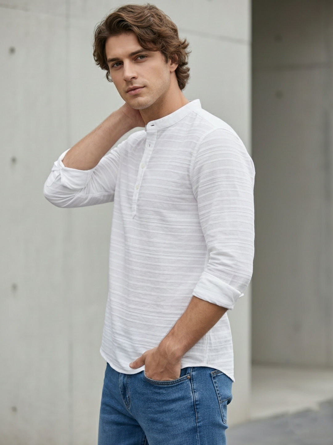 • The shirt is designed with a stylish curved hemline and a distinctive mandarin collar, which adds a touch of elegance and sophistication to the overall look.