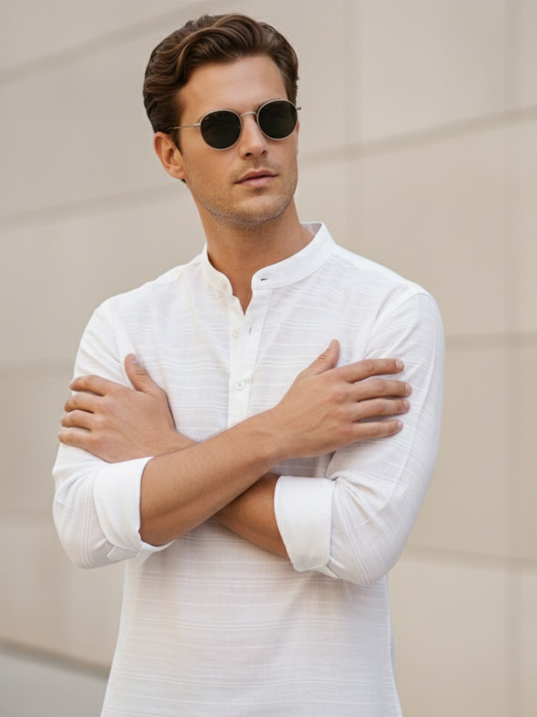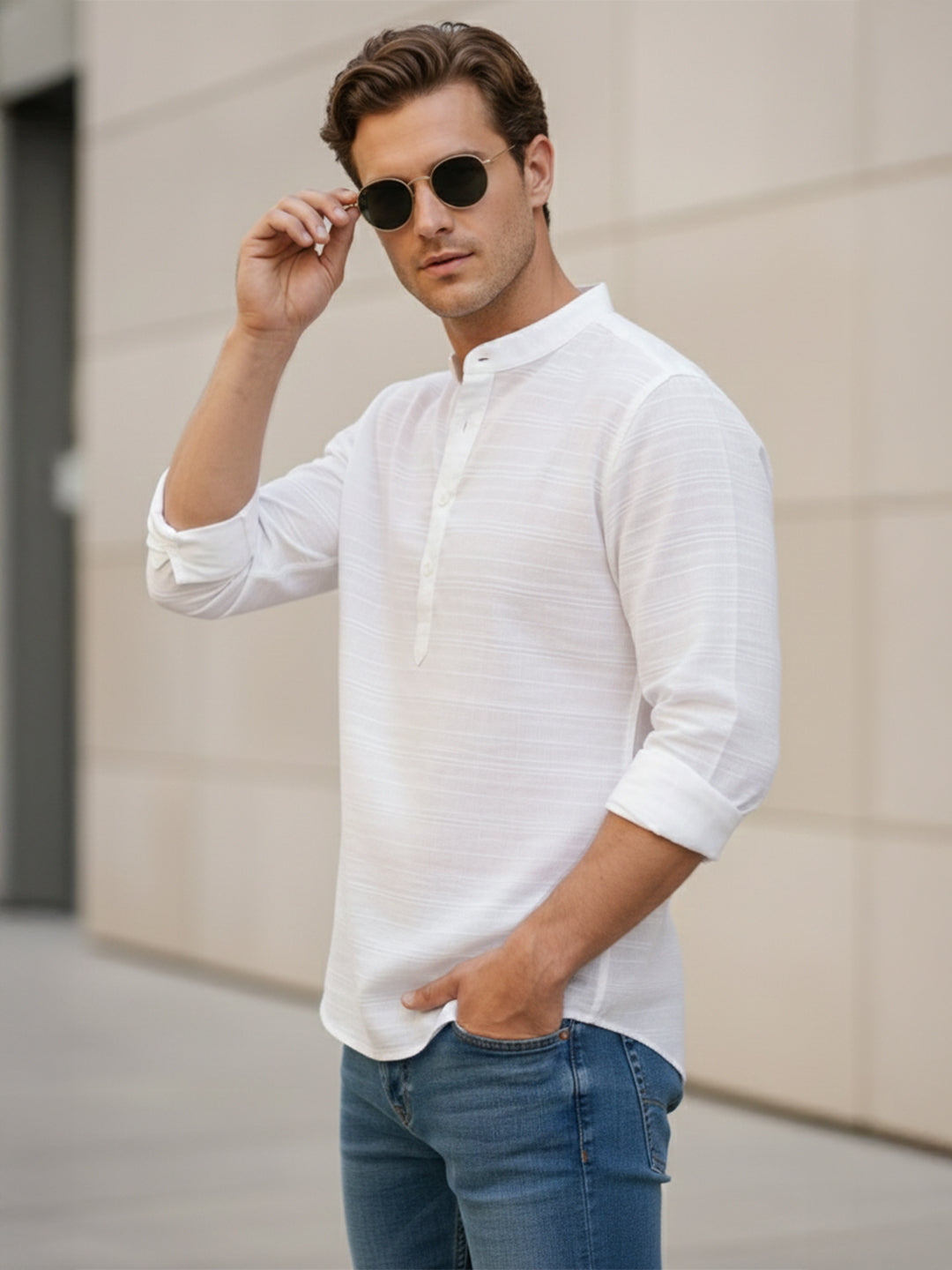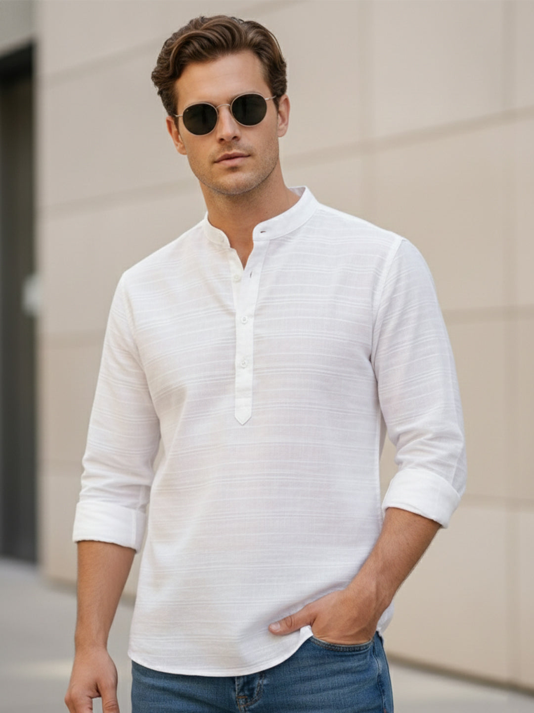 • The shirt is designed with a stylish curved hemline and a distinctive mandarin collar, which adds a touch of elegance and sophistication to the overall look.