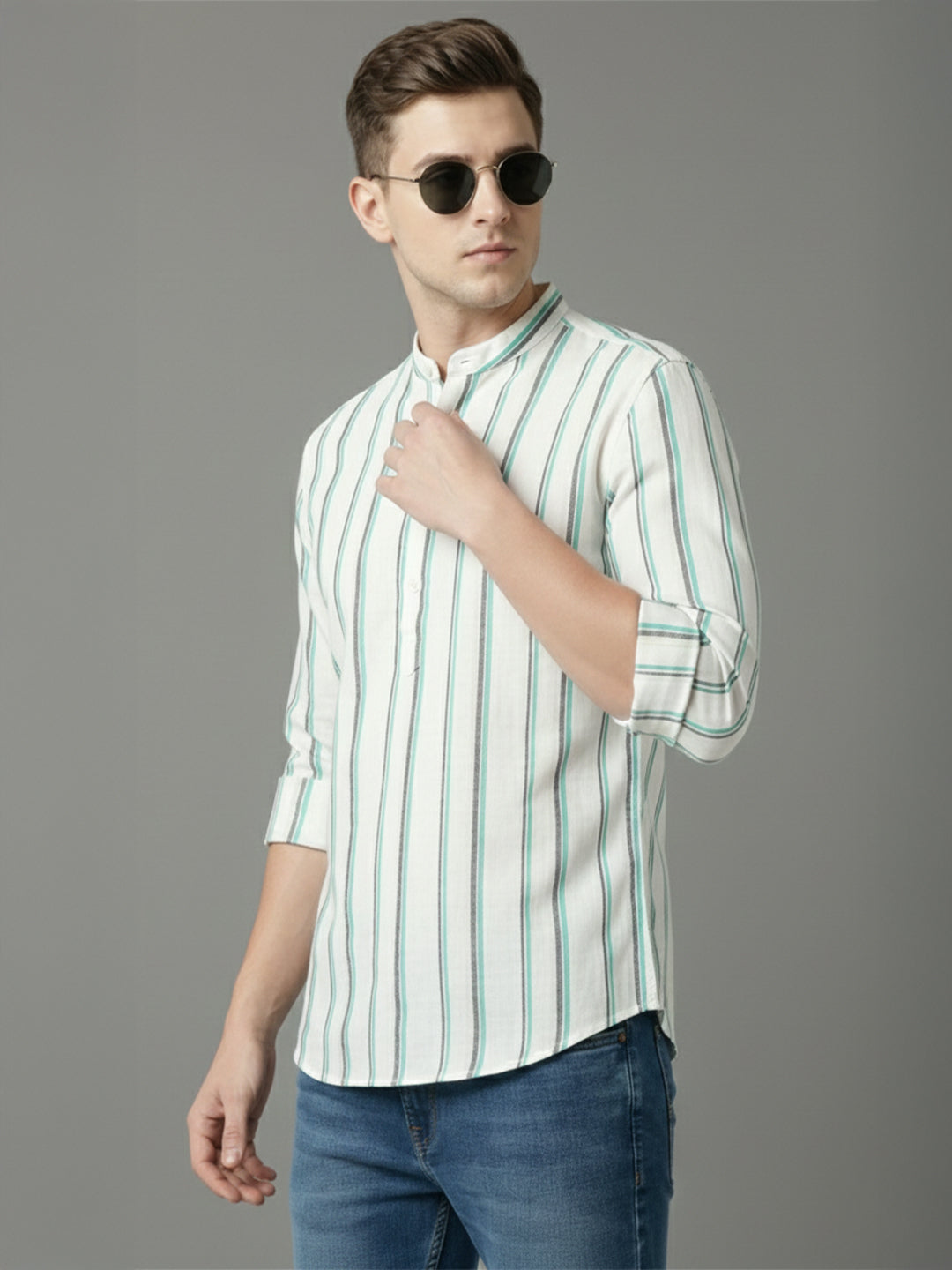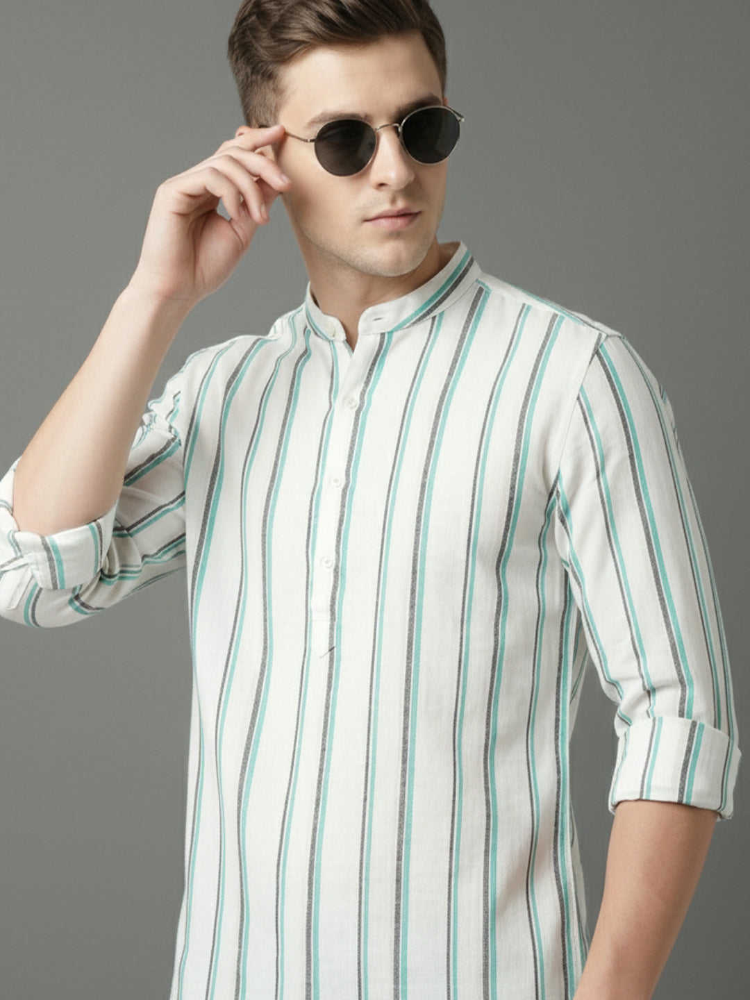 • The shirt is designed with a stylish curved hemline and a distinctive mandarin collar, which adds a touch of elegance and sophistication to the overall look.