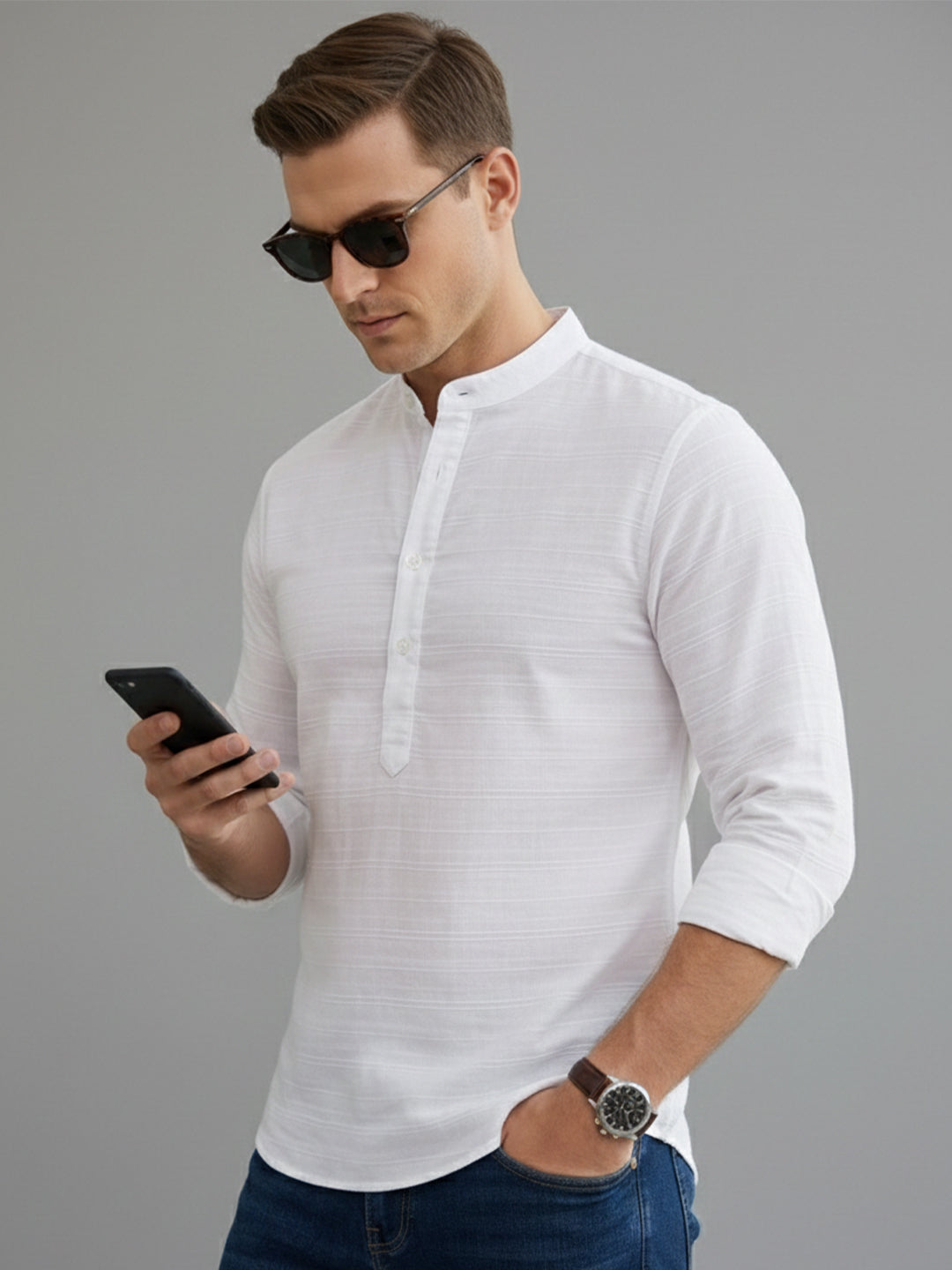 • The shirt is designed with a stylish curved hemline and a distinctive mandarin collar, which adds a touch of elegance and sophistication to the overall look.